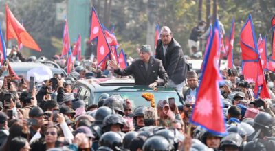 शुक्रबार, फागुन १, काठमाडौं । पूर्वराजा ज्ञानेन्द्र शाह झापाबाट काठमाडौं आइपुगेका छन्। त्रिभुवन अन्तर्राष्ट्रिय विमानस्थलमा अवतरणपछि उनलाई स्वागत गर्न समर्थकहरूको उल्लेखनीय उपस्थिति देखिएको थियो। विमानस्थलको गेट क्षेत्रमा भेला भएका समर्थकहरूले विभिन्न नारासहित स्वागत गरेका थिए। पूर्वराजा शाहले सवारी साधनबाट हात हल्लाउँदै उपस्थित समर्थकप्रति आभार व्यक्त गरेका छन्। विमानस्थल परिसरमा सुरक्षाको