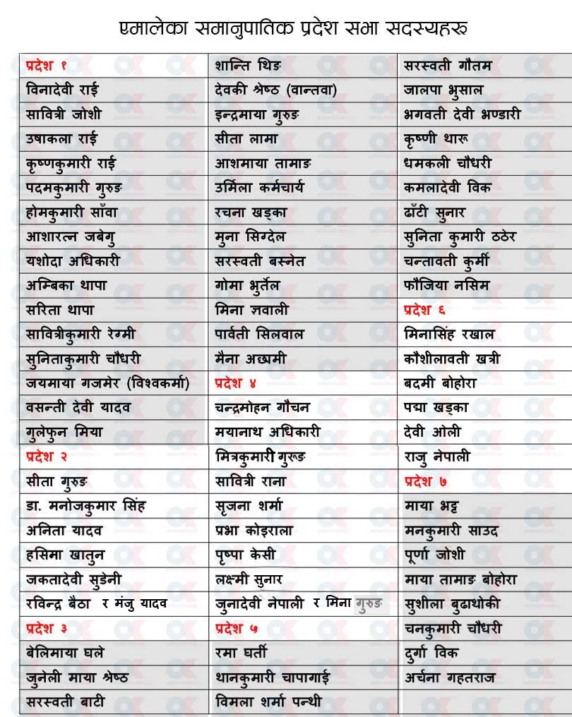 समानुपातिकबाट प्रदेशसभा सदस्य बन्नेमा अधिकांश महिला छन् । प्रदेश २, ४ र ६ मा केही पुरुष छन् भने अन्य प्रदेशबाट महिला मात्र सिफारिस भएका छन् ।प्रत्येक प्रदेशमा पार्टीले पाएको कुल सिटको ३३ प्रतिशत महिला हुनु पर्ने संवैधानिक व्यवस्था भएकाले समानुपातिकबाट प्रदेशसभा सदस्य हुने धेरै महिला भएका हुन् ।