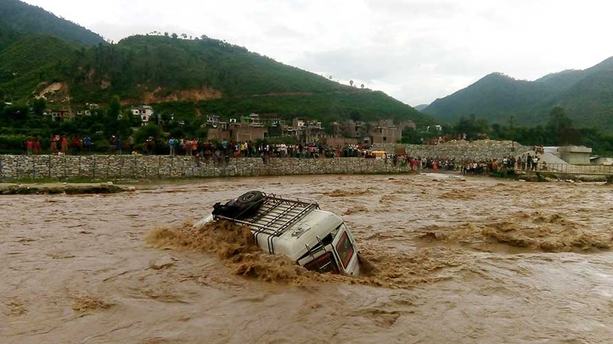 भाद्र ८,सल्यान । हेर्दाहेर्दै छिन्चु-जाजरकोट सडकखण्ड अन्तर्गत सल्यानको बनगाड खोलाको बाढीले माइक्रो बस बगाएको छ । खोला पार गर्दागर्दै बाढीले गाडी बगाउन थालेपछि यात्रुहरुले हाम फालेर ज्यान जोगाएका छन् । बिहीबार जाजरकोटबाट नेपालगञ्जका लागि छुटेको हाइस माइक्रो बस बाढीमा बगेको हो । यात्रुहरुले हाम फालेर ज्यान जोगाए पनि उनीहरुका झोला लगायतका सामान भने बगेको छ । ढुंगामा अड्किएको गाडीलाई डोजरको सहायताले निकालिएको थियो ।