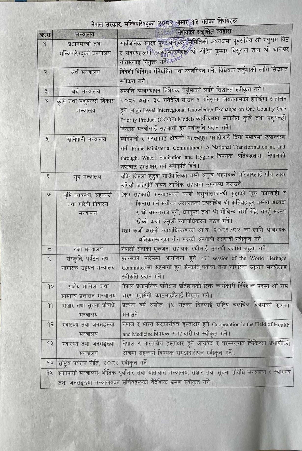 काठमाडौं, असार १६ – सरकारले हालै सम्पन्न मन्त्रिपरिषद् बैठकका १५ निर्णयहरू सार्वजनिक गरेको छ। सञ्चार तथा सूचना प्रविधि मन्त्री तथा सरकारका प्रवक्ता पृथ्वीसुब्बा गुरुङका अनुसार असार १३ गते बसेको मन्त्रिपरिषद् बैठकले विभिन्न नीतिगत तथा प्रशासनिक निर्णयहरू गरेको हो।