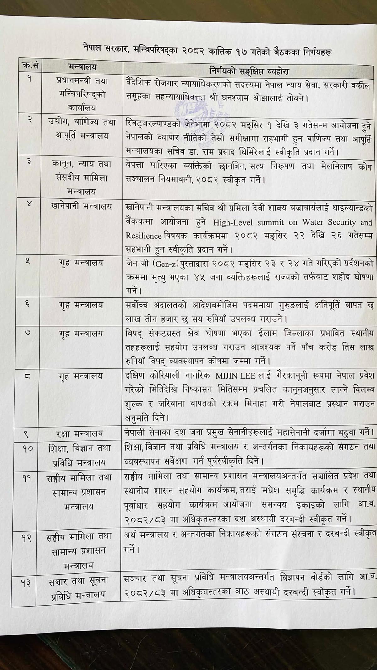 सार्वजनिक सार्वजनिक मन्त्रिपरिषद् बैठकका १३ निर्णयहरू यस प्रकार छन्: