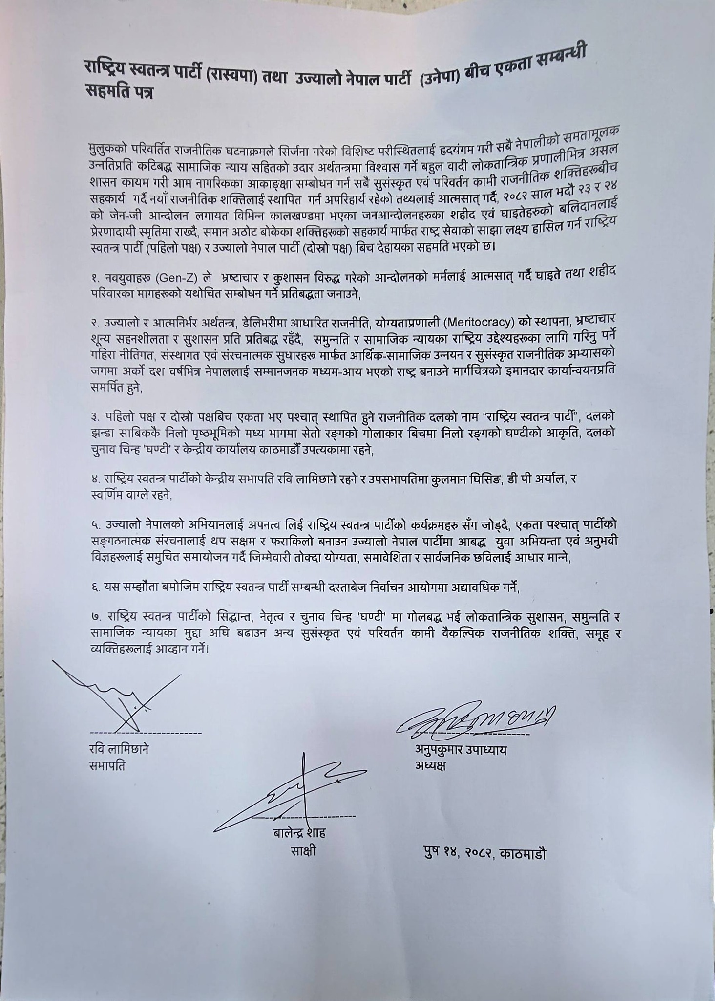 एकतासम्बन्धी सहमतिपत्रमा रास्वपाका सभापति रवि लामिछाने, उज्यालो नेपाल पार्टीका अध्यक्ष अनुपकुमार उपाध्याय र साक्षीका रूपमा काठमाडौं महानगरपालिकाका मेयर बालेन्द्र शाहले हस्ताक्षर गरेका छन्।